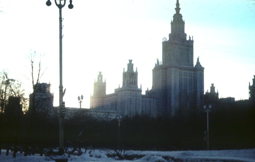 Moscow university fence. University main building. In the university class. Larissa Sudakova and Valentin Popov talking Prof. Goncharsky at a lecture. In the students' lunchroom. Left to right: Michael Rozhdestvensky, Valentin Popov and me.