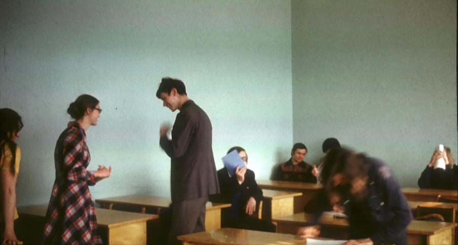 In the university class. Larissa Sudakova and Valentin Popov talking